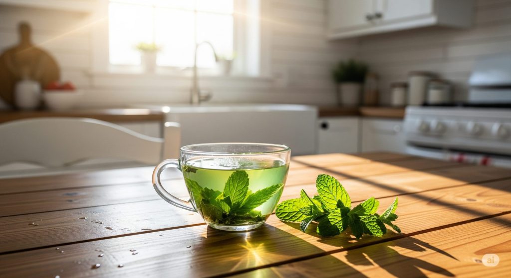 • フレッシュハーブティー: 摘みたてのミントの葉を数枚カップに入れ、お湯を注ぐだけで、心安らぐフレッシュハーブティーが楽しめます。