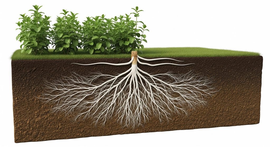 地下茎とは、その名の通り、土の中で横へ横へと伸びていく茎のことです。ミントはこの地下茎を四方八方に伸ばし、その節々から新しい芽を出して増えていきます。地上に見えているミントを刈り取っても、土の中に広大なネットワークのように地下茎が張り巡らされているため、そこから次々と新しいミントが再生してしまうのです。