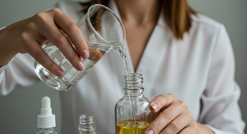 - 加える: 次に、精製水を加えて、容器のキャップをしっかりと閉めてから、白く濁るまでよく振り混ぜます。