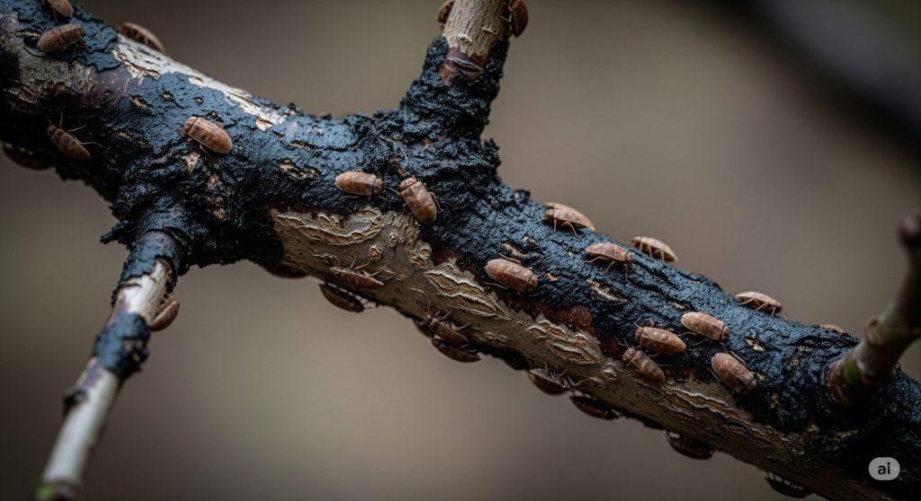 - 「すす病」の誘発: カイガラムシは、糖分を多く含んだベタベタした排泄物を出します。これを「甘露(かんろ)」と呼びます。この甘露を栄養源として黒いカビが発生するのが「すす病」です。葉や幹が黒いすすで覆われたようになり、光合成が妨げられて、さらなる生育不良を引き起こします。アリが植物に集まっている場合、この甘露が目的である可能性が高いです。