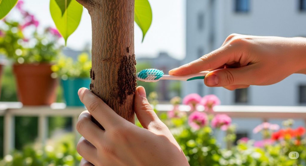 - 歯ブラシやヘラなどを使って、カイガラムシを優しくこすり落とします。植物の幹や葉を傷つけないように注意してください。